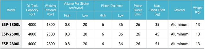 ESP超高壓手動(dòng)液壓泵規(guī)格二: ESP-1800L、ESP-2500L、ESP2800L 可用油量4000cc 每行程容積(高)0.8 cc/周期 每行程容積(低)20毫升/周期 最大壓力1800~2800bar