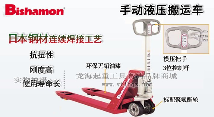 進口手動液壓搬運車優(yōu)勢 ●Bishamon進口手動液壓搬運車整車采用日本鋼材連續(xù)焊接工藝,在不降低強度的情況下,使鐵板的厚度變薄,實現(xiàn)了主體重量的輕量化; ●Bishamon手動叉車采用模壓把手設(shè)計,使操作更舒適、更容易抓持; ●進口手動液壓搬運車具有3位控制桿,通過手指即可控制整個液壓系統(tǒng); ●日本Bishamon進口手動液壓搬運車外表均采用環(huán)保的無鉛油漆,更加環(huán)保和安全; ●進口手動液壓搬運車標配堅固耐用的聚氨酯輪子,也可根據(jù)顧客需要選擇尼龍輪; ●日本Bishamon手動叉車汽缸采用活塞式,重要的密封部分使用U形密封圈,不漏油; ●客戶可根據(jù)使用情況選擇不銹鋼液壓搬運車,防腐防銹。